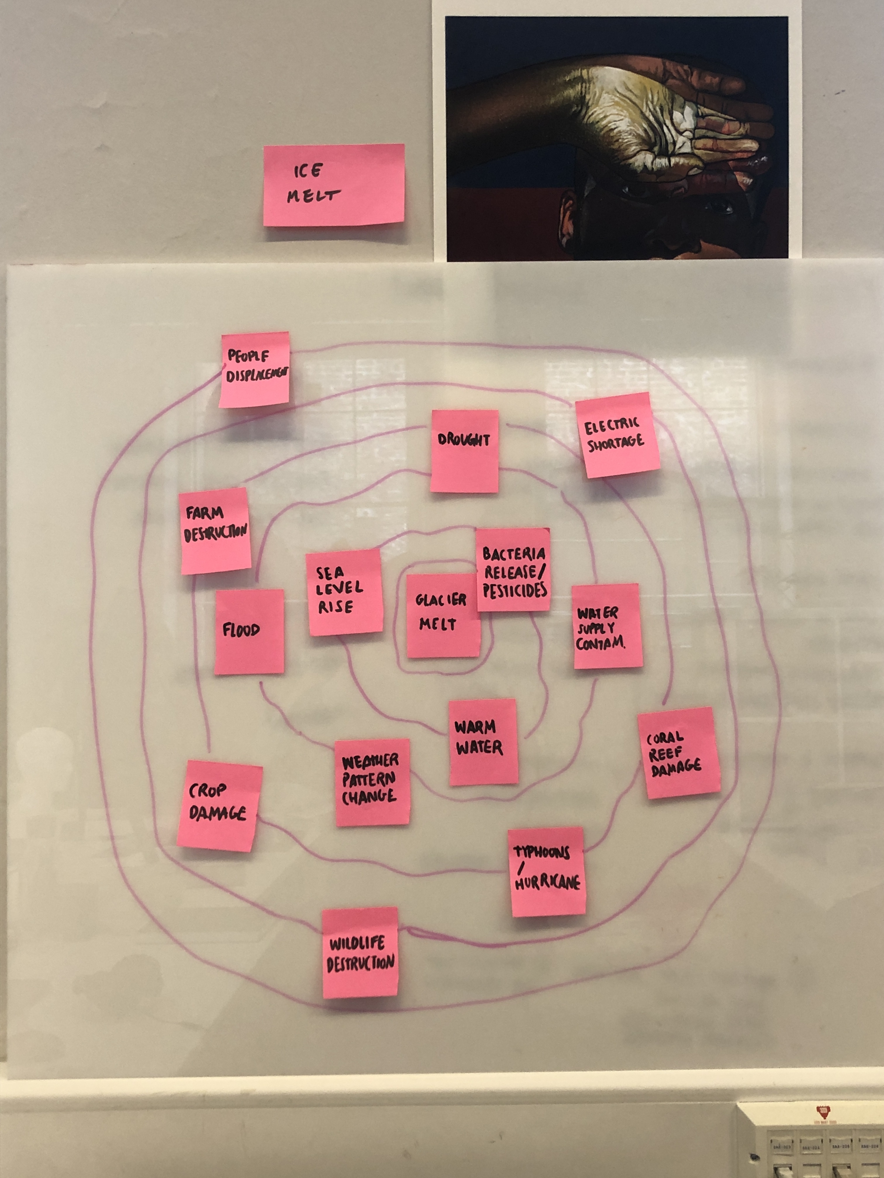 The artwork explores the cascade effects of accelerated warming, cryosphere thaw, and rising sea levels and how the connection between all three issues could trigger ecological collapse - from prehistoric viruses emerging to the cascading effects of crops and bees vanishing.